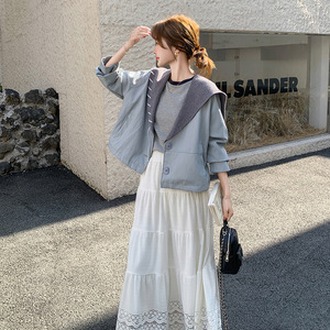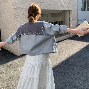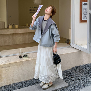 实拍蓝色设计感拼接针织海军领PU皮外套女2025春秋新款小个子上衣