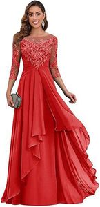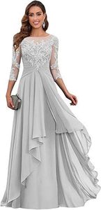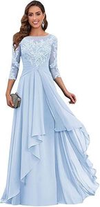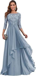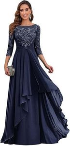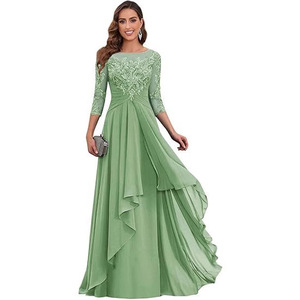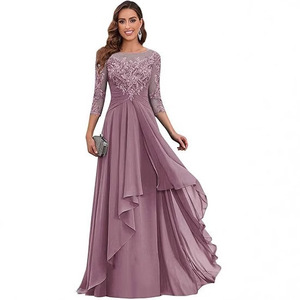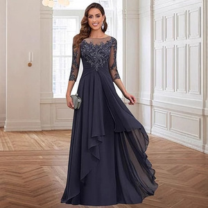 欧美晚礼服蕾丝长款2025年春季带袖低圆领雪纺速卖通亚马逊连衣裙