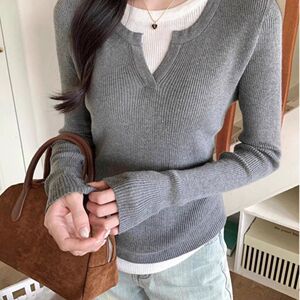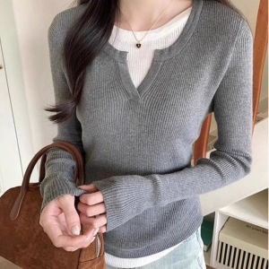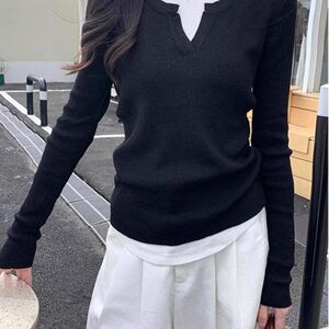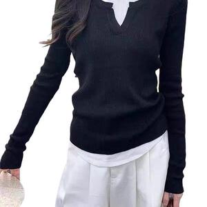 黑色v领假两件长袖针织衫女春秋内搭修身感纯欲风打底上衣ins