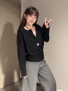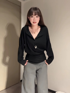 春季新款松弛感宽松黑色上衣大码胖mm韩系设计感V领显瘦长袖T恤潮