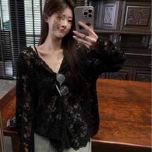 2025甜辣风黑色领内搭长袖蕾丝衫女秋季新款显瘦单排扣镂空上衣