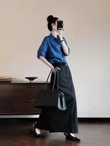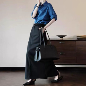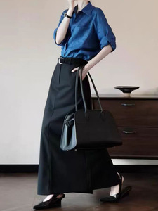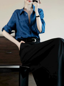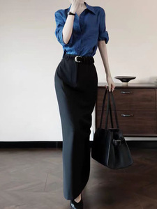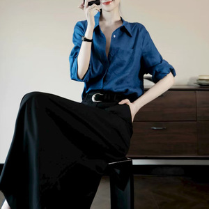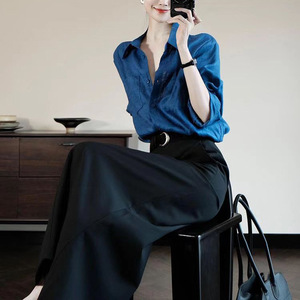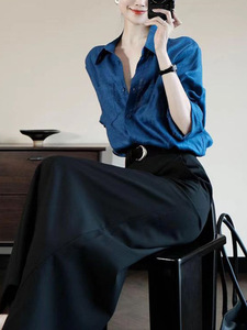 轻职场通勤穿搭气质上衣高级感轻奢减龄洋气蓝色翻领衬衫套装女夏