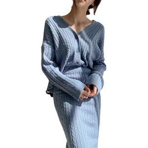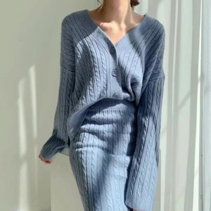 韩国chic秋冬气质V领麻花纹针织开衫毛衣+高腰包臀半身裙两件套装