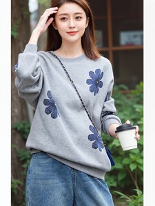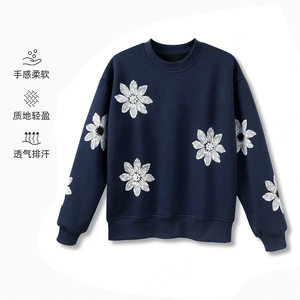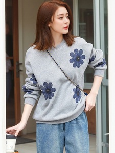 华棉百搭宽松休闲卫衣女圆领印花钉珠2025秋冬时尚上衣潮女A6457