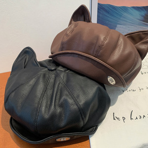 可爱卡通猫耳朵pu皮质贝雷帽女小众文艺复古显脸小云朵画家帽子潮