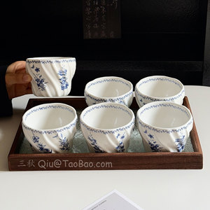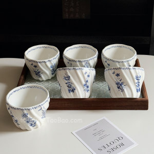 青花兰陶瓷手握杯6个+海棠花木托盘1个/套装