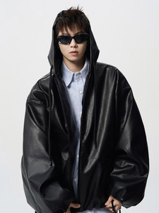 高级感机车皮夹克男士美式街头短款PU皮衣服潮牌复古廓形连帽外套