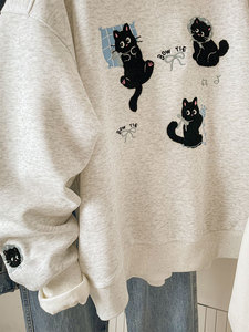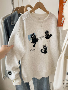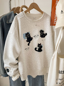 韩系慵懒风猫咪刺绣无帽卫衣女宽松大码胖mm爆款卫衣上衣女A6459