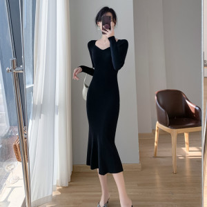 跨境实拍2025秋冬新款V领修身中长款过膝内搭打底鱼尾针织连衣裙