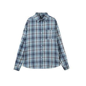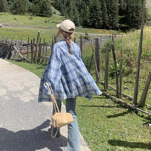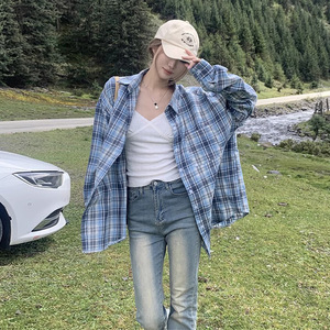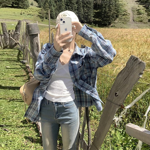 2025新款森系潮流蓝色格纹衬衫外套女宽松休闲遮肉中长款衬衣外穿