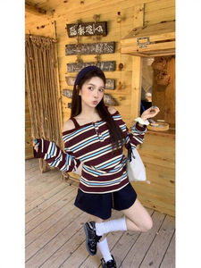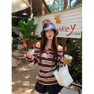 美式复古撞色条纹设计一字肩吊带上衣ins秋季收腰显瘦辣妹长袖T恤