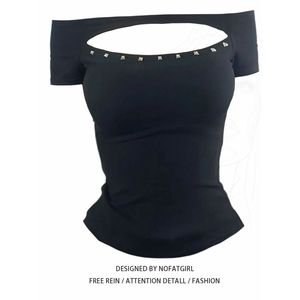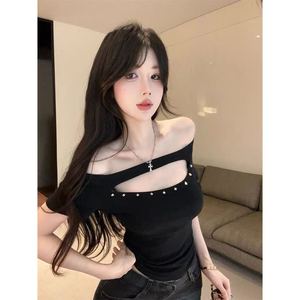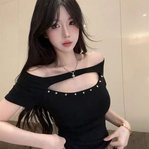 韩系镂空一字肩短袖T恤女夏季纯欲辣妹露肩辣妹修身内搭短款上衣