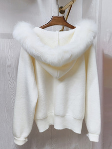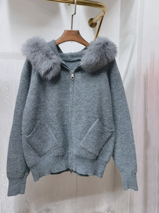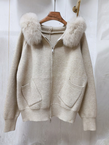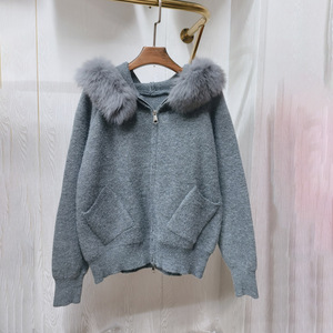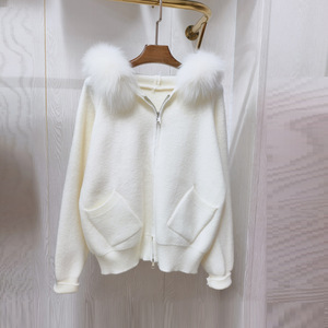 真狐狸毛大毛领连帽毛衣开衫外套女秋冬高级新短款双拉链针织上衣