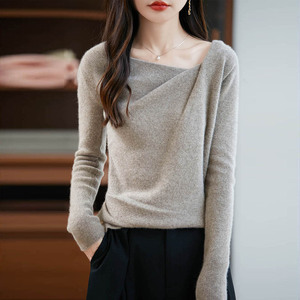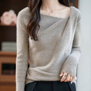 纯羊毛针织套头衫女式四平褶皱领内搭秋冬新款修身显瘦打底毛衣潮
