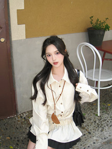 美式复古条纹长袖收腰衬衫女装早秋甜辣风气质高腰百褶裙裤两件套
