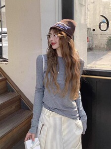 韩系蓝色圆领微透卷边长袖打底衫女秋季辣妹薄款修身显瘦T恤上衣