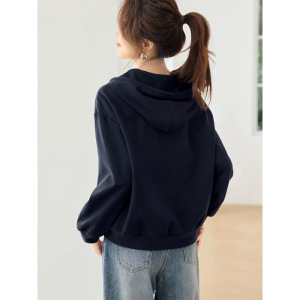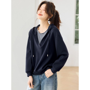 智性轻通勤拼接撞色条纹休闲上衣2025秋季新款女连帽卫衣