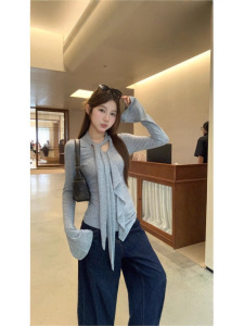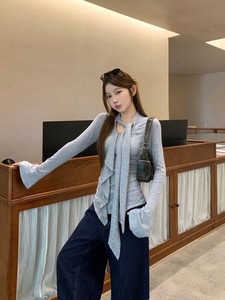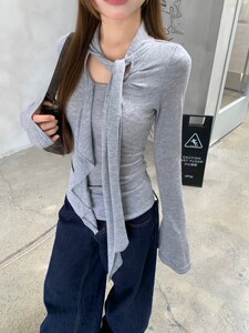 春秋修身显瘦正肩纯色长袖T恤女别致飘带荷叶边设计内搭打底上衣