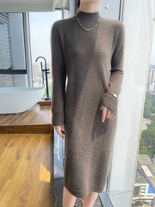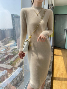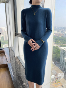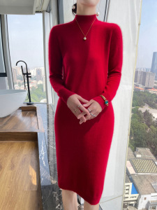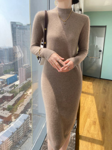 纯羊毛中长款连衣裙女秋冬新款半高领修身纯色针织长裙包臀毛衣裙