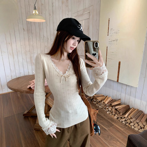 韩系花边蝴蝶结v领长袖T恤女2025秋季新款设计感叠穿修身打底上衣