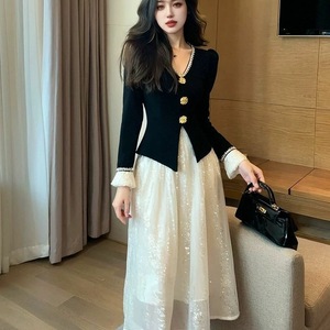 法式高级感洋气连衣裙女春秋韩版收腰显瘦假两件名媛千金风长裙子