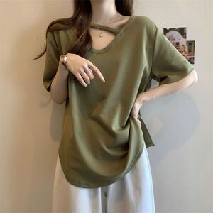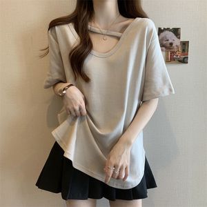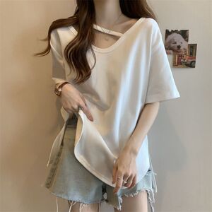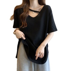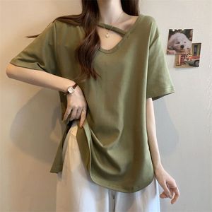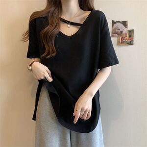 大码中长款短袖T恤女夏季打底衫2025新款宽松显瘦设计感开叉上衣
