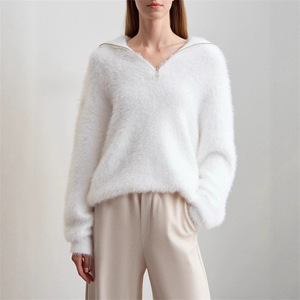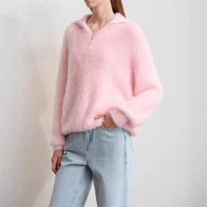 跨境亚马逊2025新款仿水貂绒翻领半拉链毛衣女宽松休闲针织衫上衣