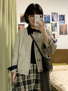 翻领拼接牛仔外套女秋季新款复古显瘦宽松短款小个子夹克上衣