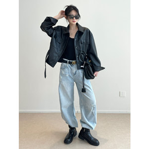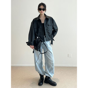 南鱼 宋佳同款 进口油蜡感蛋白皮短外套收腰显瘦机车风pu皮衣女秋