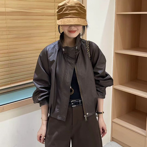 短款PU皮衣夹克外套女2025秋季新款宽松时尚休闲百搭机车咖色上衣