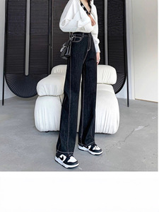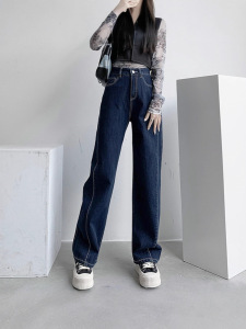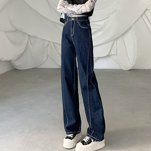 哥家商场同款女装2025秋季百搭纯色竖条休闲高腰直筒牛仔裤长裤