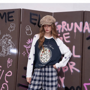 妖精的 「爱弹琴草莓猫」插肩长袖t恤女早秋慵懒风休闲上衣