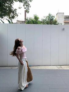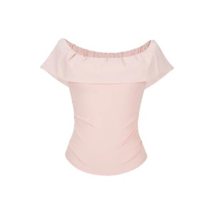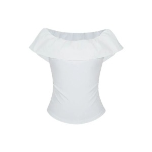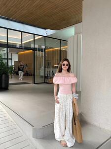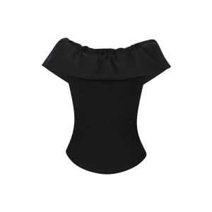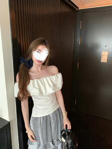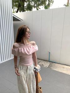 【40支酷丝绵拼原版面料】一字肩荷叶边短袖T恤褶皱法式短款上衣