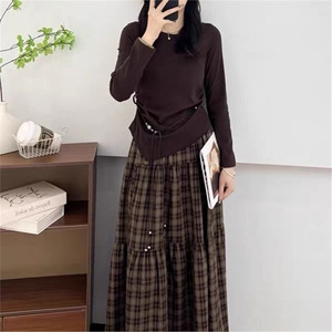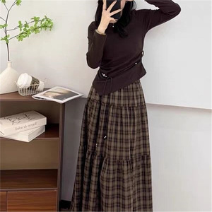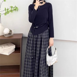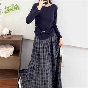 2025年秋季时尚套装女设计感长袖T恤上衣中长款格子半身裙两件套