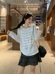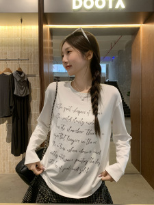 纯欲白色圆领休闲字母印花长袖T恤女2025秋季新款宽松慵懒风上衣