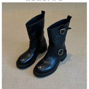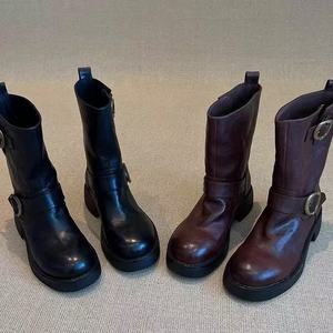 头层水洗牛皮2025秋冬新款皮带扣骑士靴女粗跟百搭骑士靴