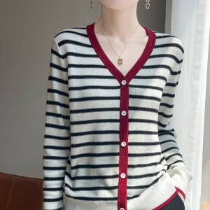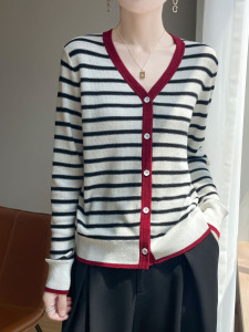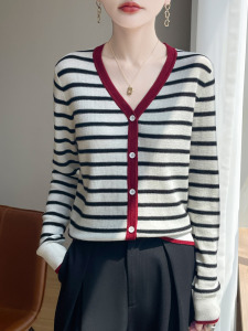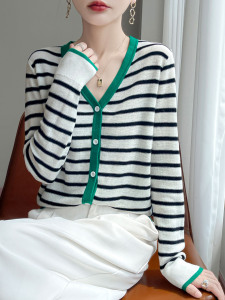 清新风奢美新款早秋羊毛外套女V领上衣轻薄空气感撞色条纹针织开