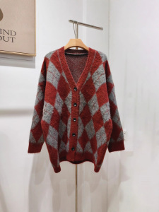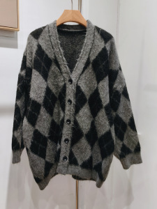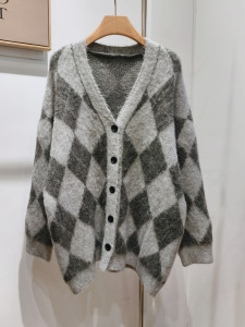 秋冬新款复古美式开衫毛衣女外套中长款显瘦慵懒风菱形格针织上衣