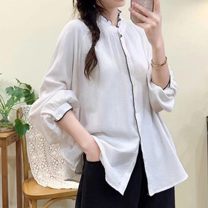 领双层棉纱时尚休闲长袖T恤女春秋新款宽松麻衬衫开衫上