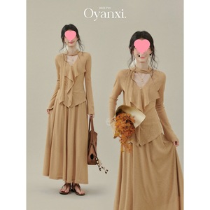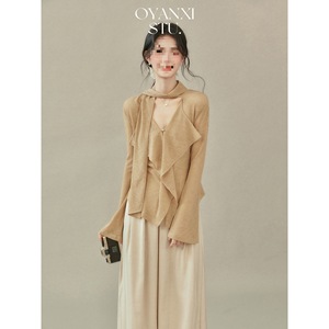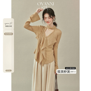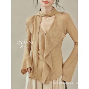 跨境《入秋松弛系》设计感飘带V领T恤女5秋季新长袖衣磨毛