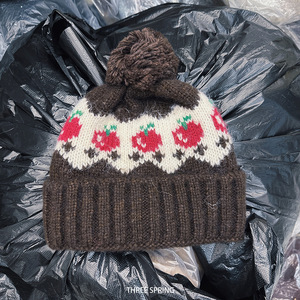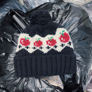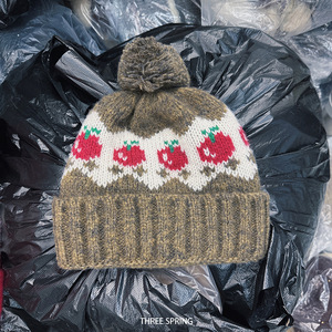 批发韩国2025年秋冬新款韩版苹果条纹毛球针织帽费尔岛护耳毛线帽