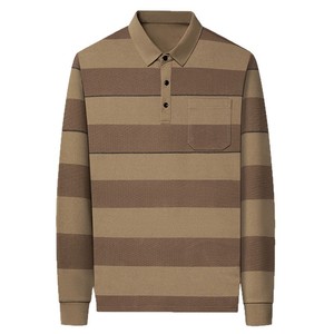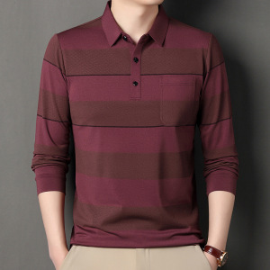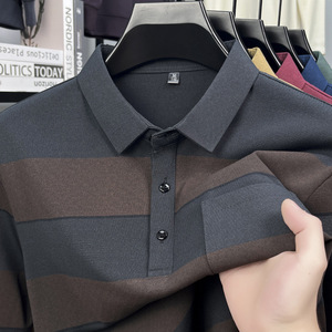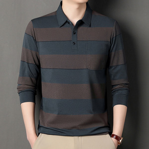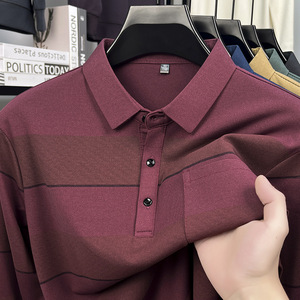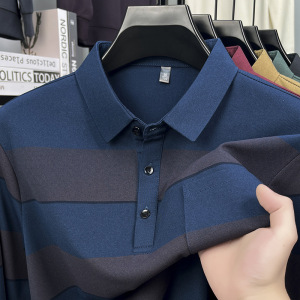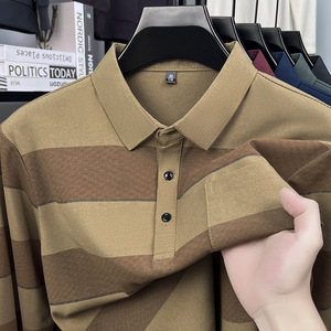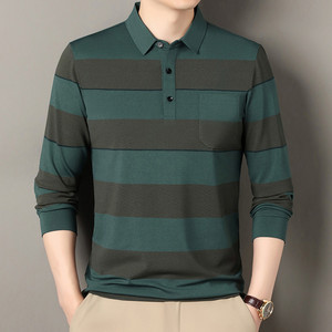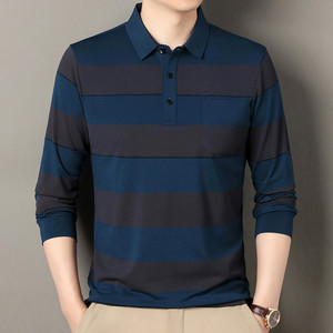 秋季男士条纹长袖t恤中年商务休闲翻领上衣爸爸装宽松百搭polo衫