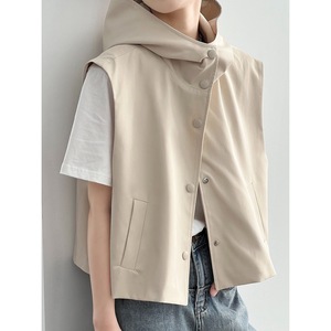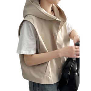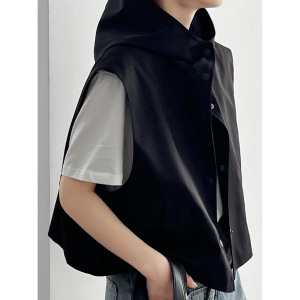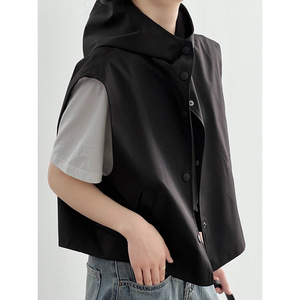 黑色连帽马甲女春秋宽松休闲短款背心外套叠穿小个子坎肩无袖上衣