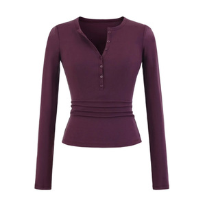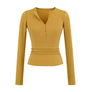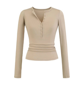 天丝V领纽扣长袖T桖女2025秋季新款美式辣妹风纯色修身复古打底衫