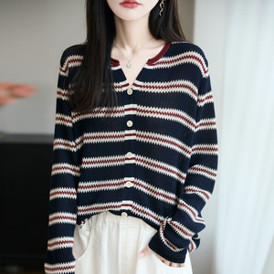 2025年早秋新款精纺羊毛卷边V领针织开衫长袖女拼色条纹宽松上衣