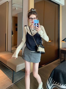 拼接假两件吊带针织长袖t恤女秋款设计感小众小个子短款内搭上衣