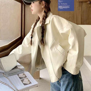 米白色皮衣外套女春秋2025新款美式复古港风小个子机车服夹克上衣