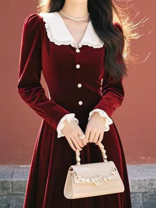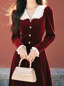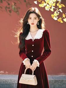 娃娃领金丝绒红色连衣裙女2025新款秋冬新款微胖掐腰裙a字中长裙