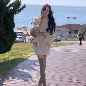 大码秋冬新款不规则设计感高领针织衫+高腰鱼尾半身裙气质两件套