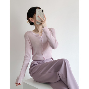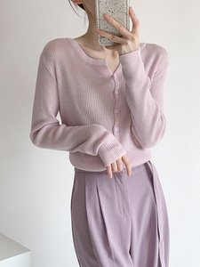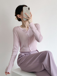 柔紫色针织开衫女薄款外搭长袖空调衫小个子内搭正肩短款上衣